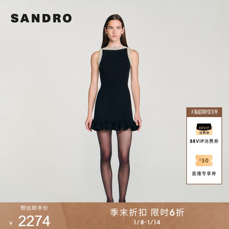 季末6折SANDRO2025秋冬新款女装黑色仿珠饰荷叶边下摆针织连衣裙