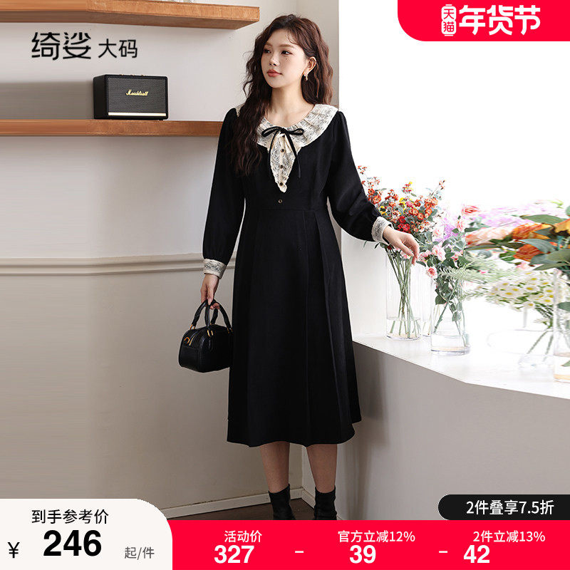 绮娑女装秋冬新款法式荷叶领收腰A字遮肉显瘦胖MM大码磨毛连衣裙