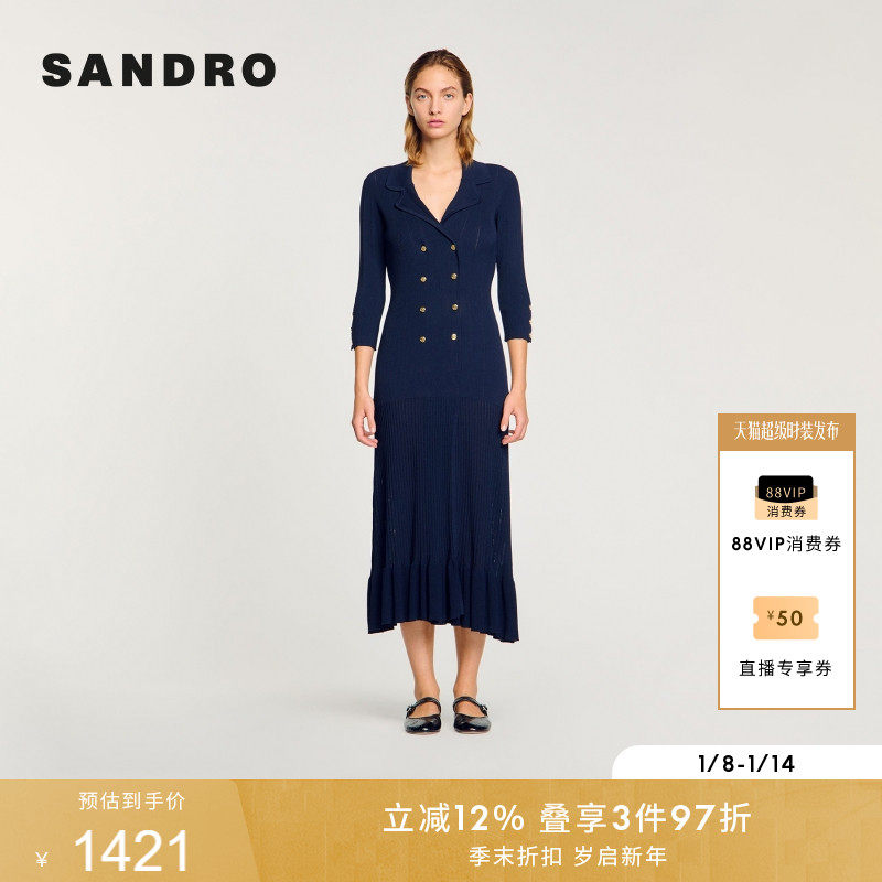 SANDRO2025秋冬女装气质优雅深蓝色V领双排扣荷叶边针织连衣裙