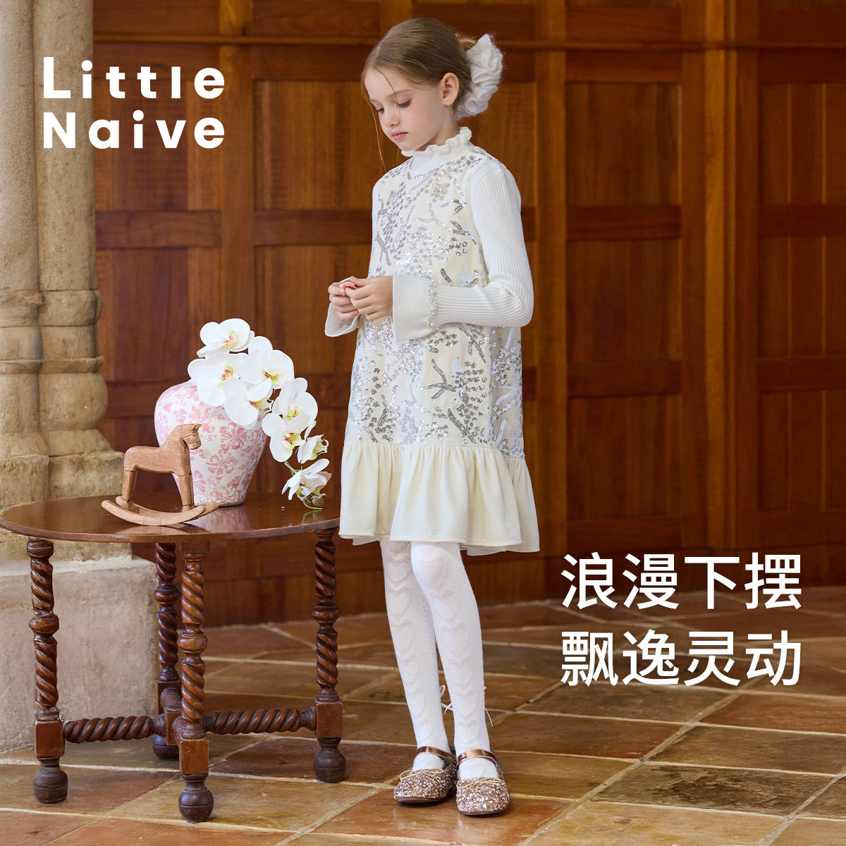 Little Naive礼服儿童丝绒珠片秋冬款荷叶边背心裙儿童加绒连衣裙
