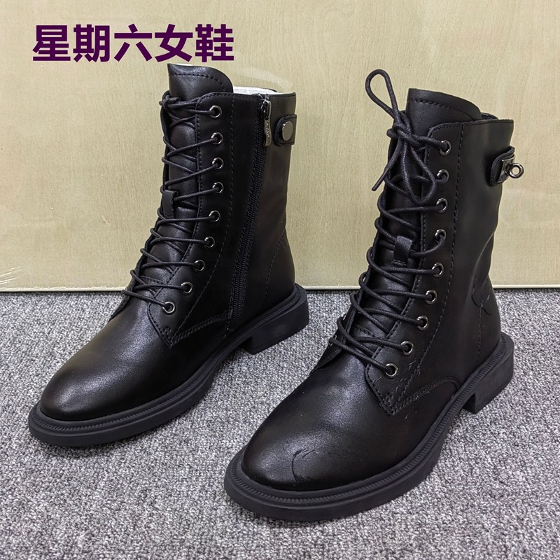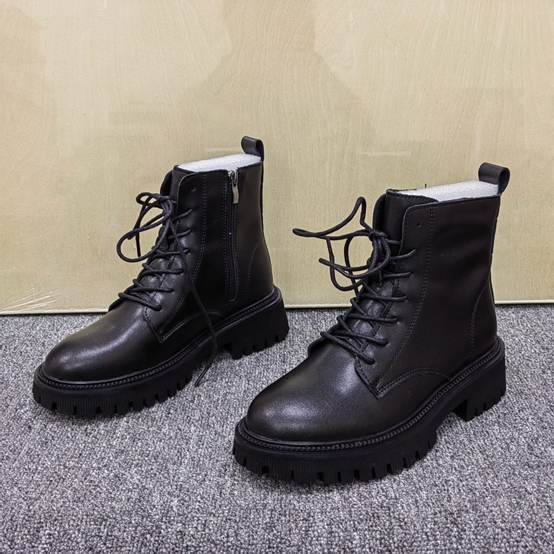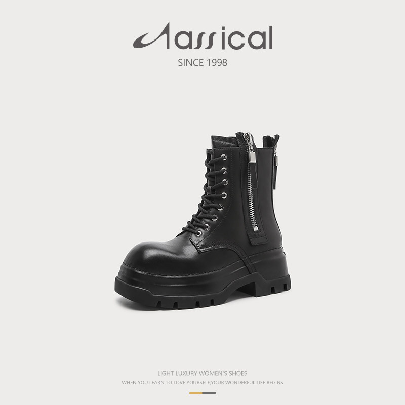 2025秋冬新款帅气英伦真皮侧拉链厚底短靴骑士靴系带中帮马丁靴