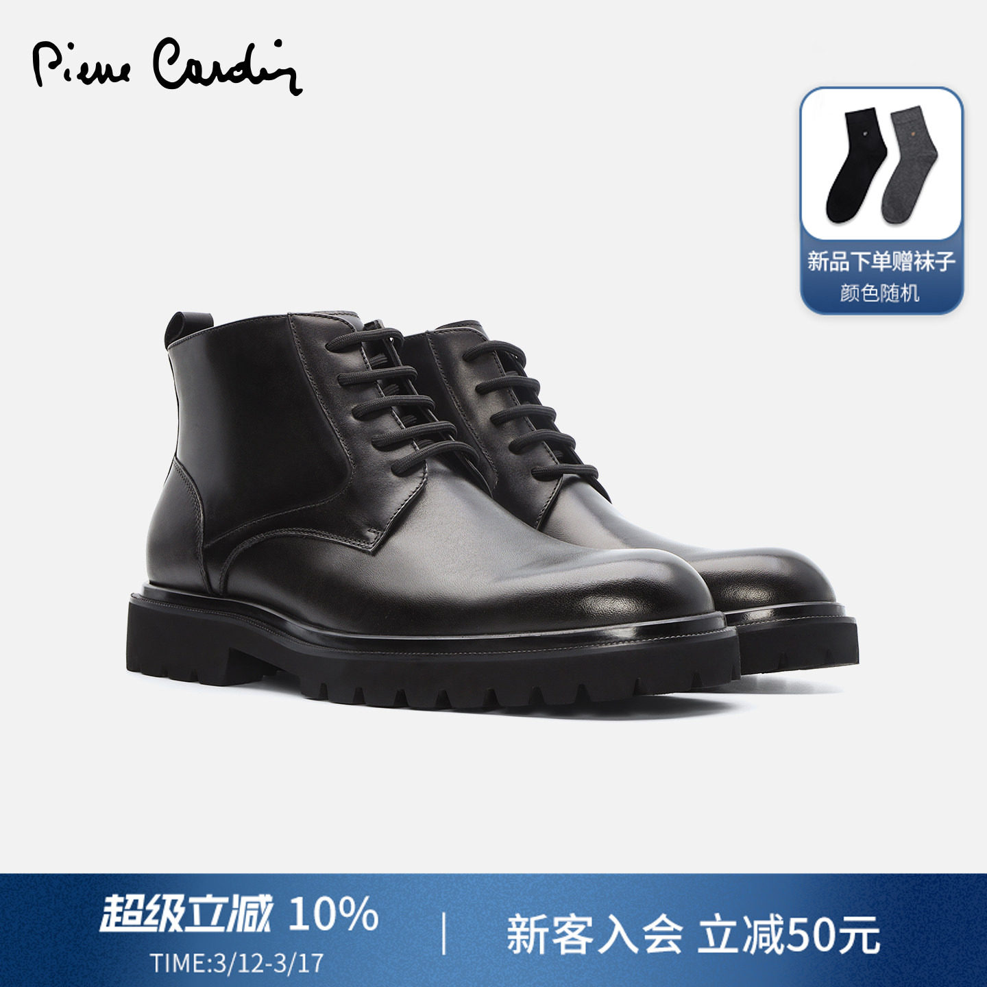 皮尔卡丹男鞋真皮中帮短靴复古手工擦色商务休闲侧拉链系带时装靴