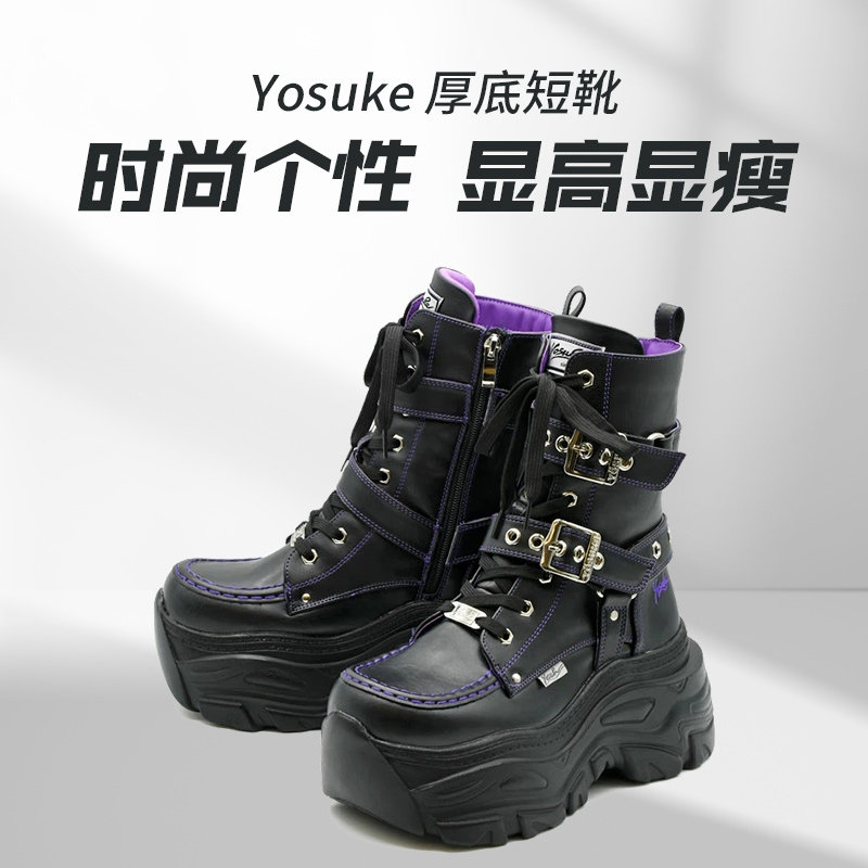 Yosuke厚底松糕女靴系带针扣侧拉链朋克风原宿jirai短靴日本直邮