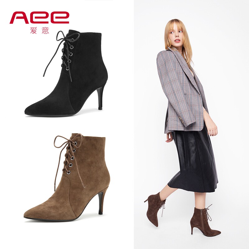 Aee/爱意短靴女复古系带高跟1618505036侧拉链细跟时装靴羊皮绒面
