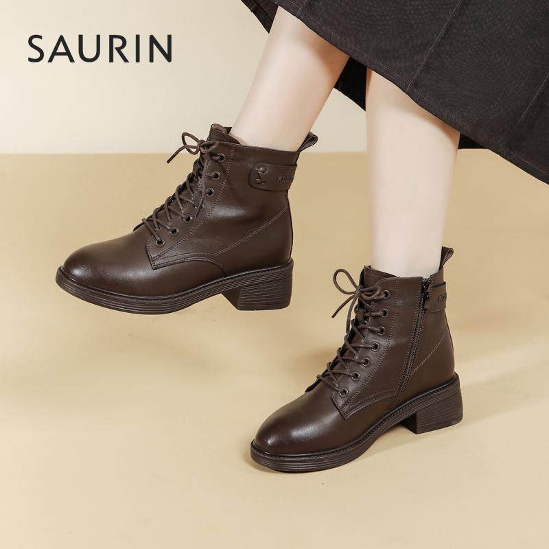 - 真皮系带马丁靴女短靴粗跟
