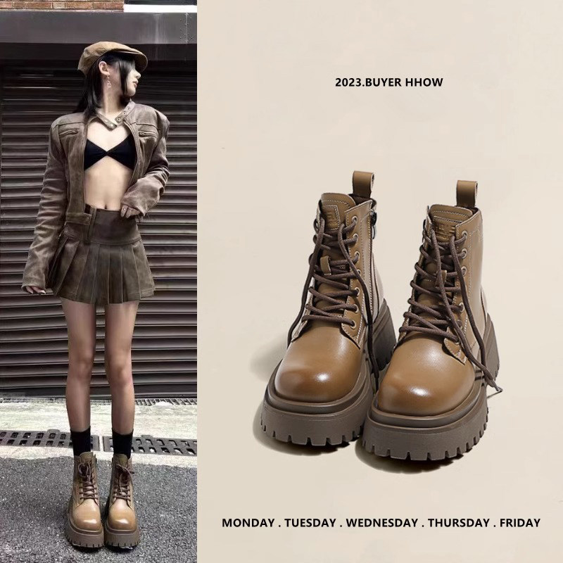 2025秋冬款复古厚底马丁靴女松糕增高粗跟系带侧拉链女靴真皮短靴