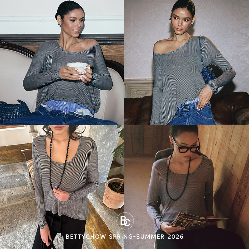 Bettychow 天丝莱赛尔黑白条纹宽松打底衫休闲风长袖大圆领上衣