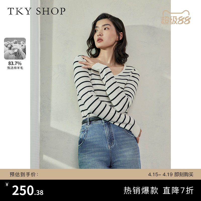 TKY SHOP复古黑白条纹撞色针织上衣女圆领套头羊毛衫修身打底衫