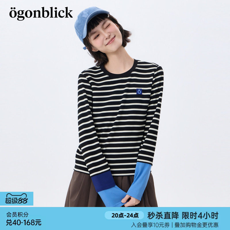 北欧时刻'黑白条纹撞色拼接T恤女26年春季新款圆领宽松打底衫上衣