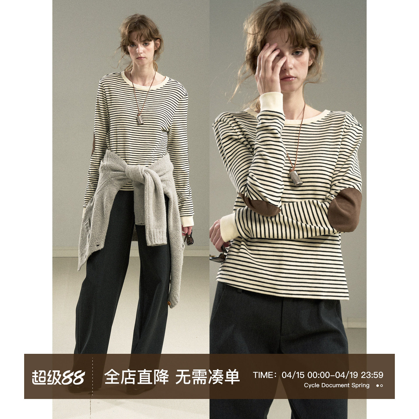 Cycle Document 经典正肩百搭黑白条纹长袖T恤女内搭补丁打底衫