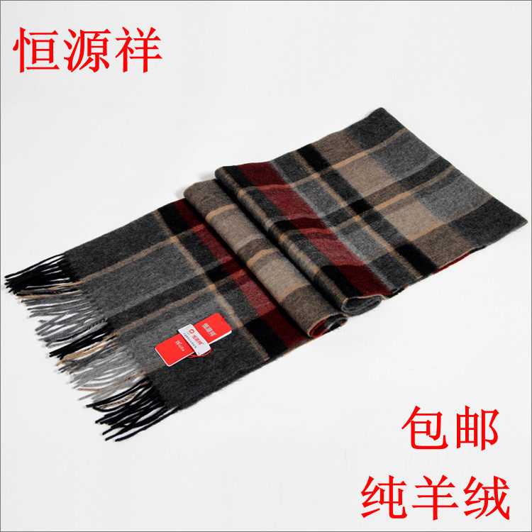 恒源祥男士纯山羊绒围巾秋冬季超长加厚英伦商务保暖蓝格子披肩潮