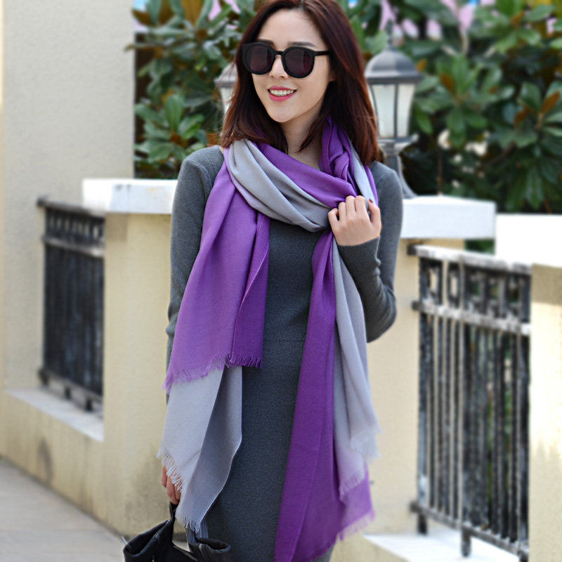 韩国秋冬季薄款羊毛围巾女士披肩两用超长2.3米渐变优雅紫色散须
