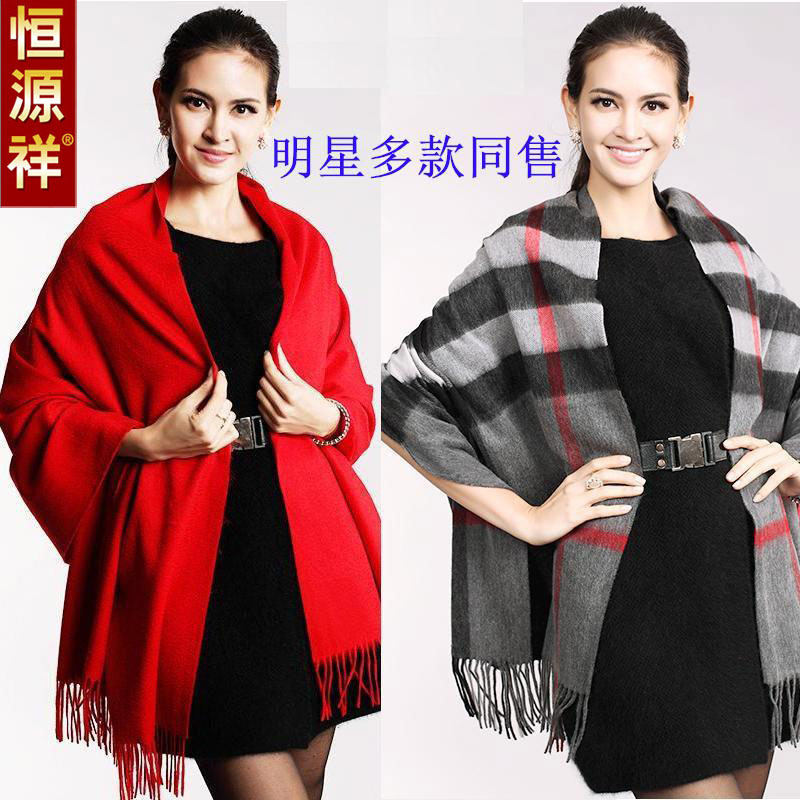 秋冬季恒源祥高档羊绒大披肩纯色红格子韩版羊毛围巾两用加厚超长
