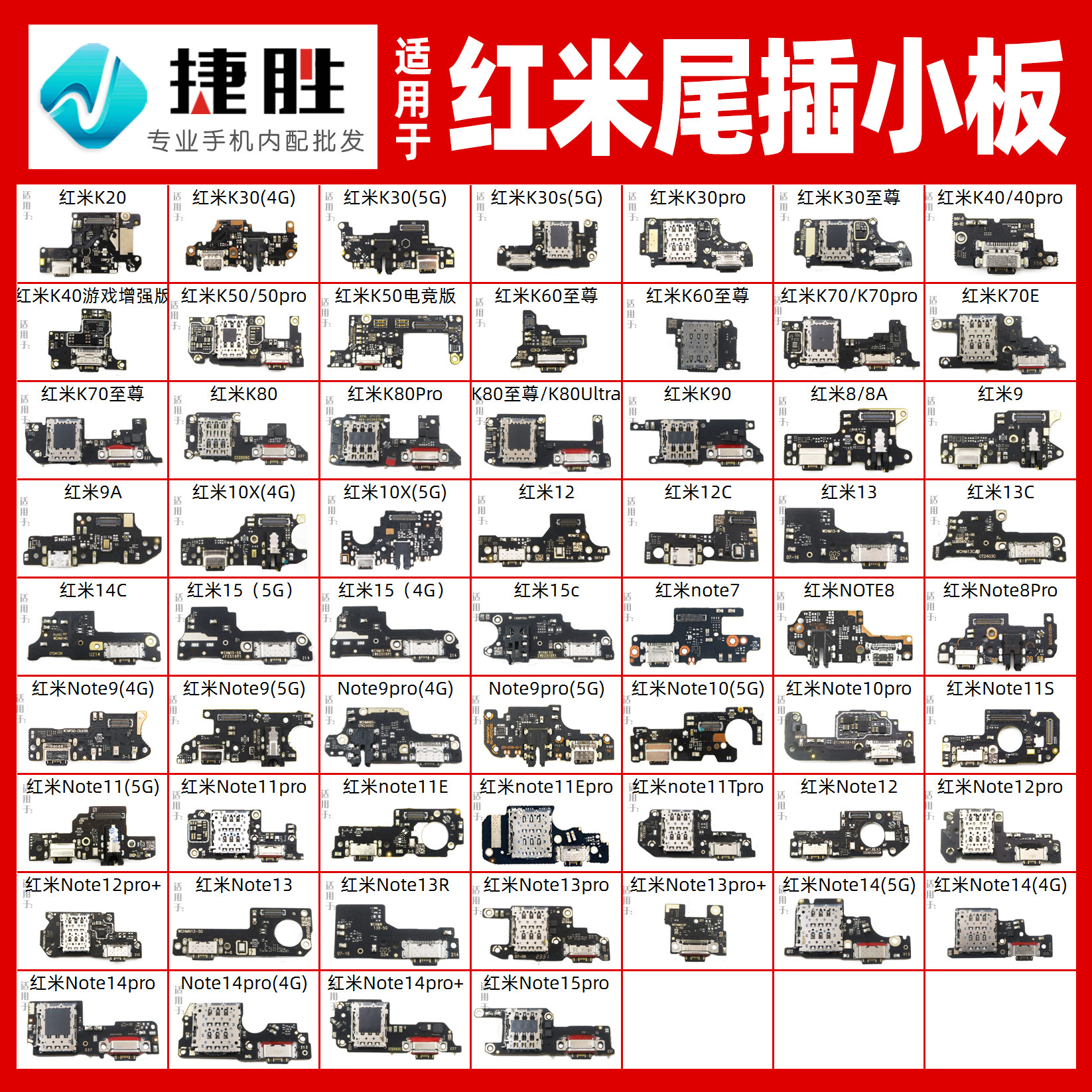 适用于红米K20 K30 K40 K50 Note 9 10 11 12 4G5G E pro尾插小板