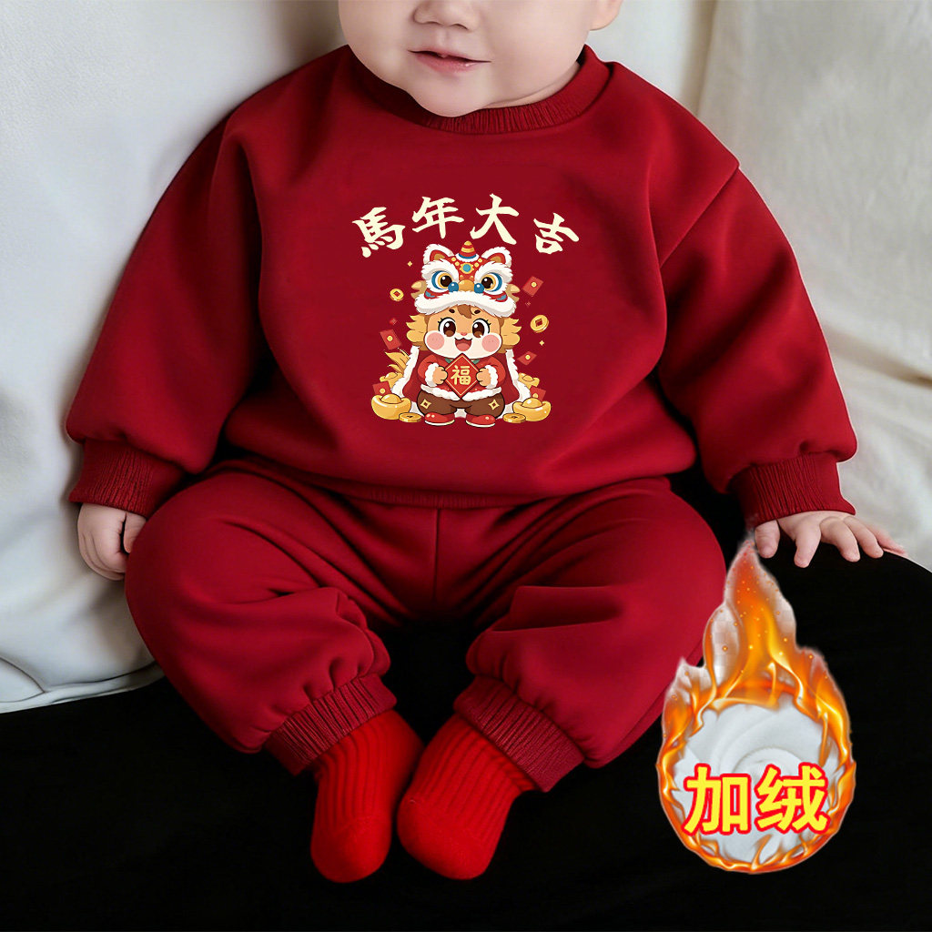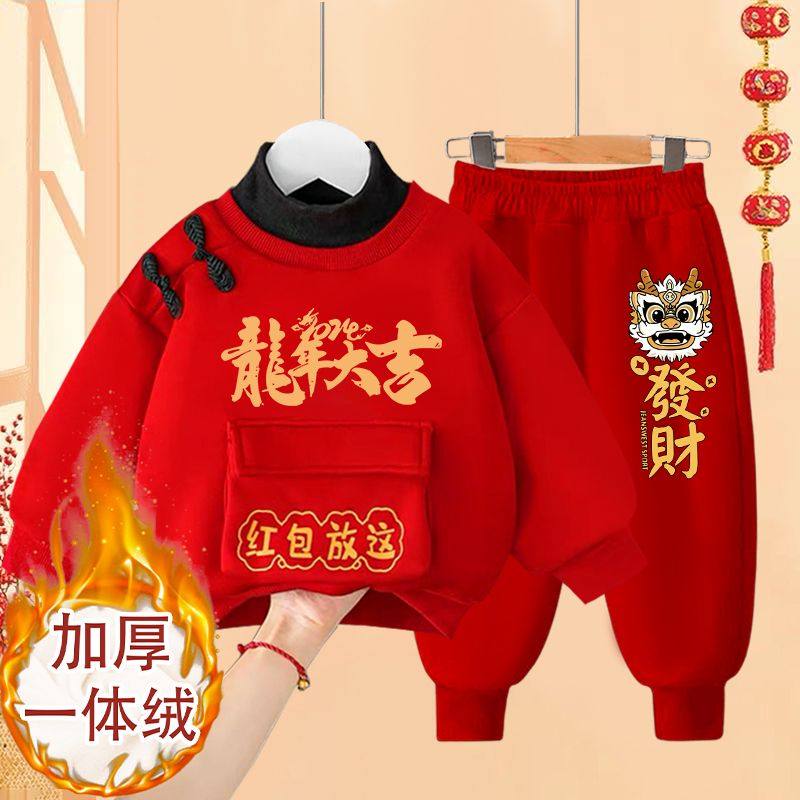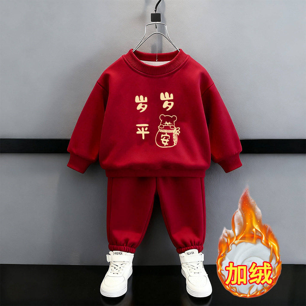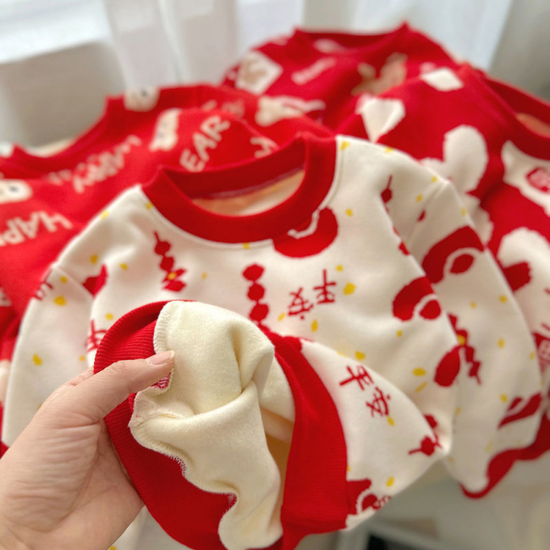 儿童加绒保暖卫衣男女宝宝加厚大红拜年服男童女童圆领中国风卫衣