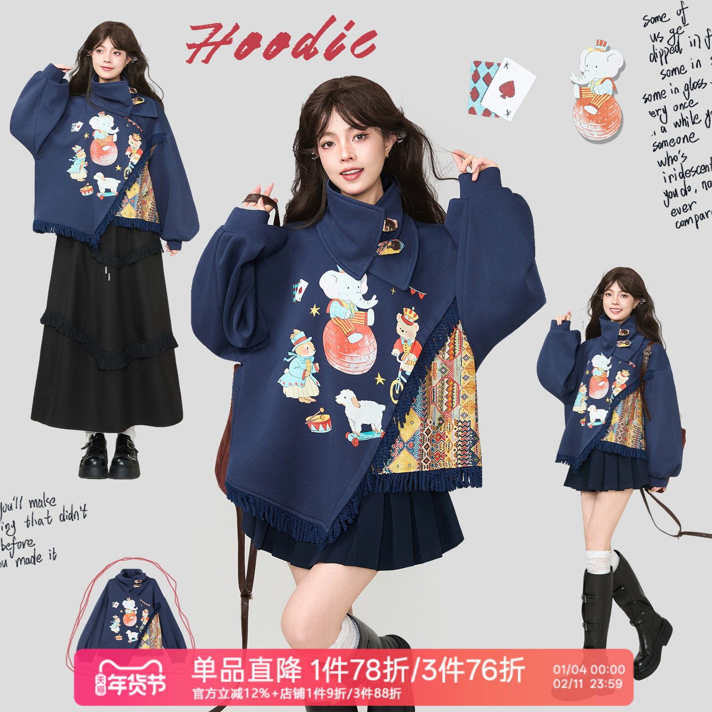 KEIKO 奇趣马戏团印花加绒卫衣2026春季中国风不规则流苏拼接上衣
