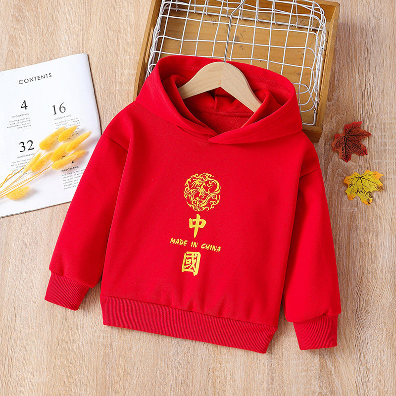 儿童纯棉中国风卫衣男女童红色喜庆连帽加绒宝宝上衣国潮春秋冬装