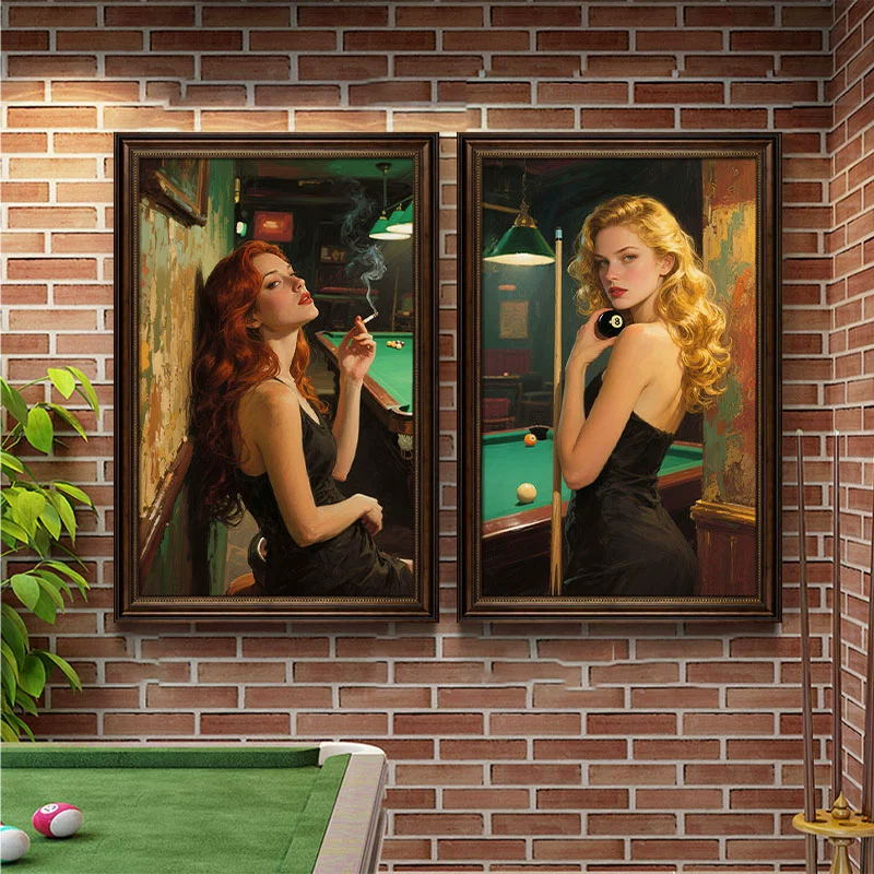 桌球主题酒吧清吧装饰画台球厅俱乐部性感美女挂画走廊复古框壁画