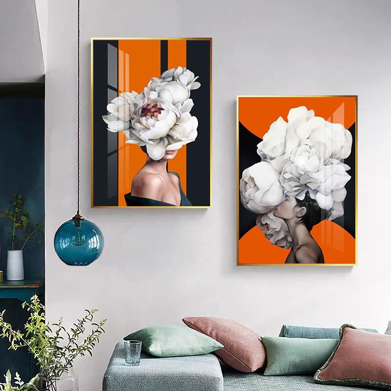橙色艺术美女挂画玄关装饰画服装店背景墙现代简约长条高级感壁画