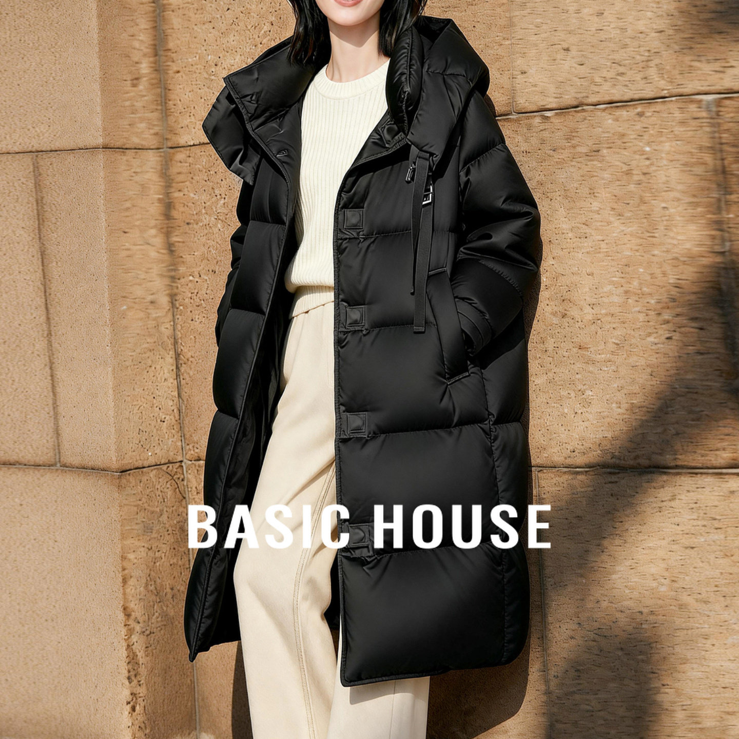 Basic House/百家好系带领围巾款鹅绒羽绒服女冬新款保暖长款外套