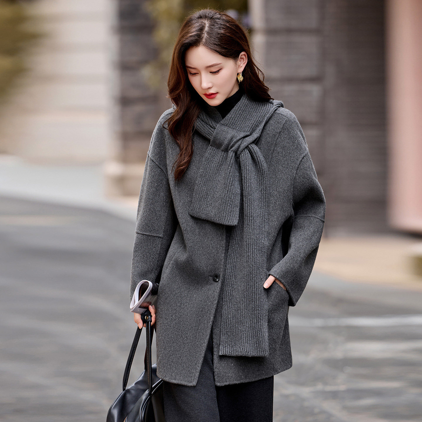 羊毛+莱赛尔 女士双面呢长款大衣 圆领炭黑色毛呢外套 带围巾冬款