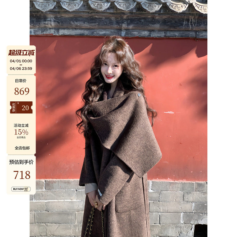 吃绿色菜【檀香木】时髦大披肩长款羊毛双面呢大衣咖色冬季女外套