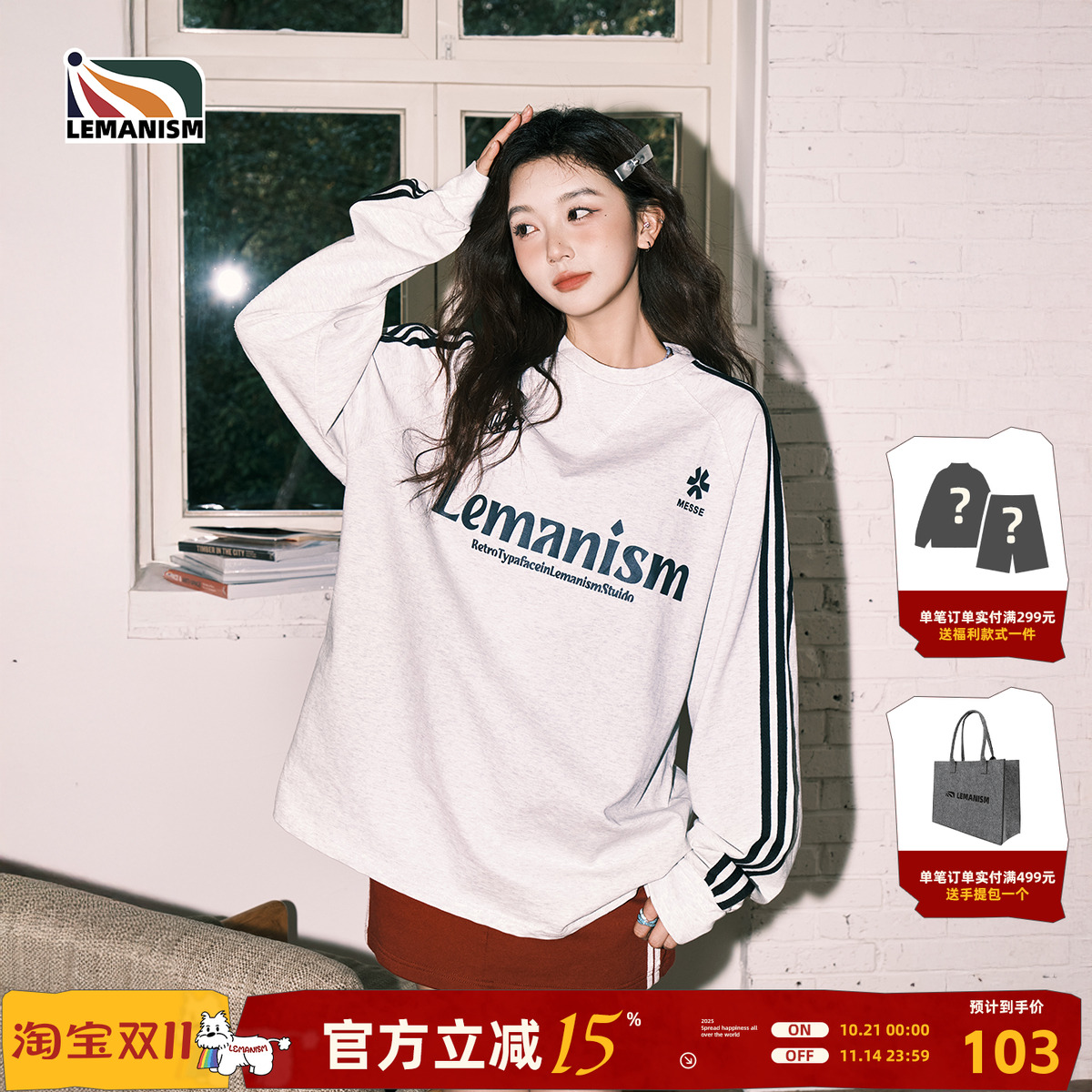 lemanism270g纯棉三条杠圆领长袖T恤男春秋情侣卫衣无帽体恤衫女
