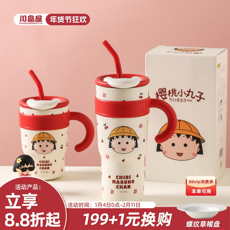 川岛屋樱桃小丸子保温杯女生大容量吸管杯子成人巨无霸水杯冰霸杯