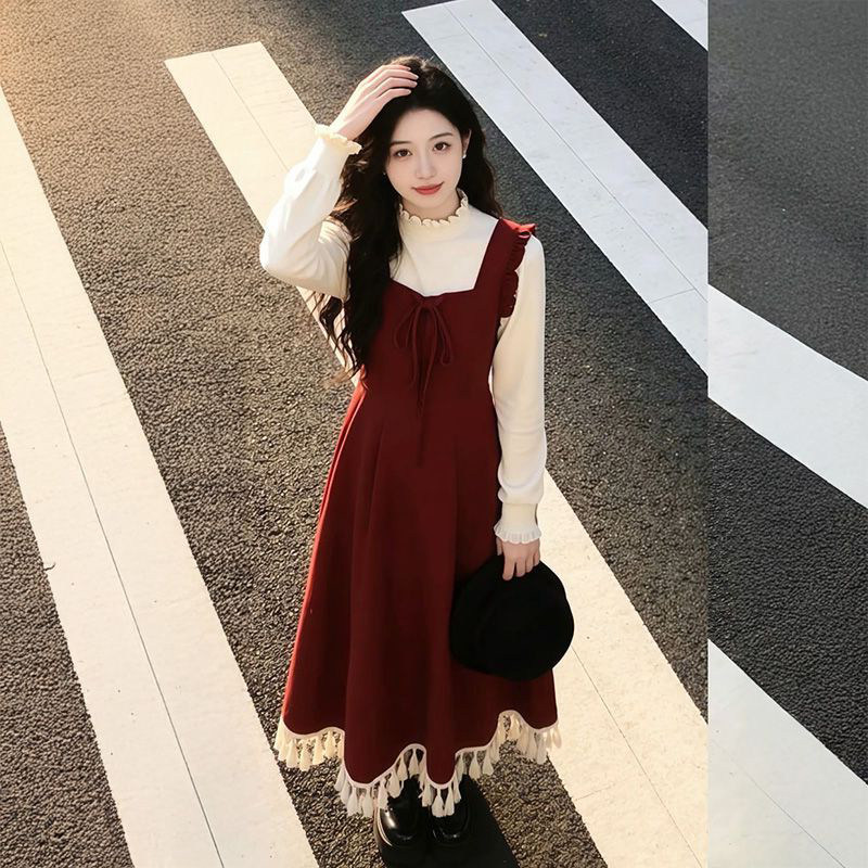 甜美温柔风气质复古红色流苏背心连衣裙女冬季叠穿打底衫上衣套装