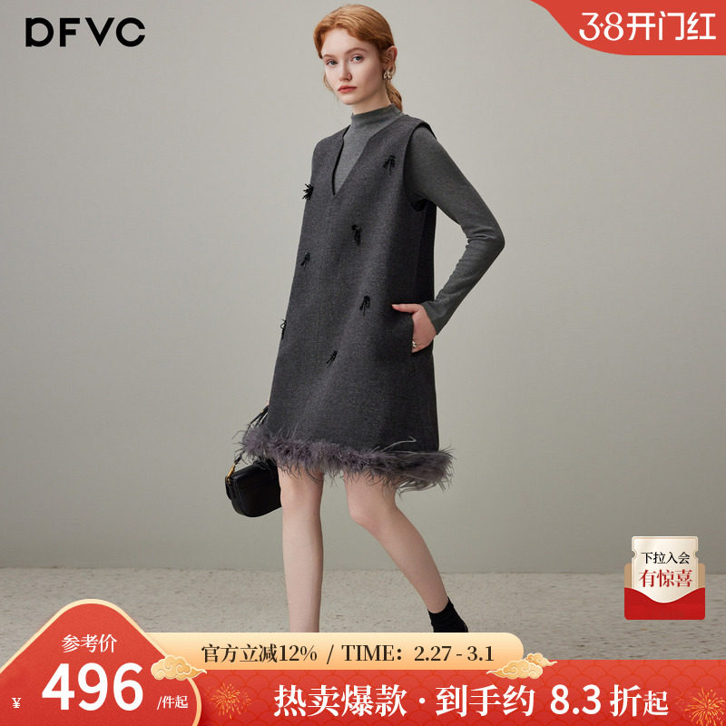 dfvc优雅V领背心裙半高领打底衫套装女2025冬季新款小个子连衣裙