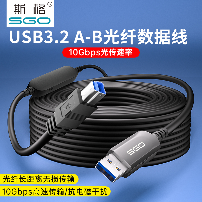 斯格光纤USB3.2 A转B数据线10Gbps打印机延长连接线加长方口直播视频会议摄像头电脑硬盘盒显示器高速传输线