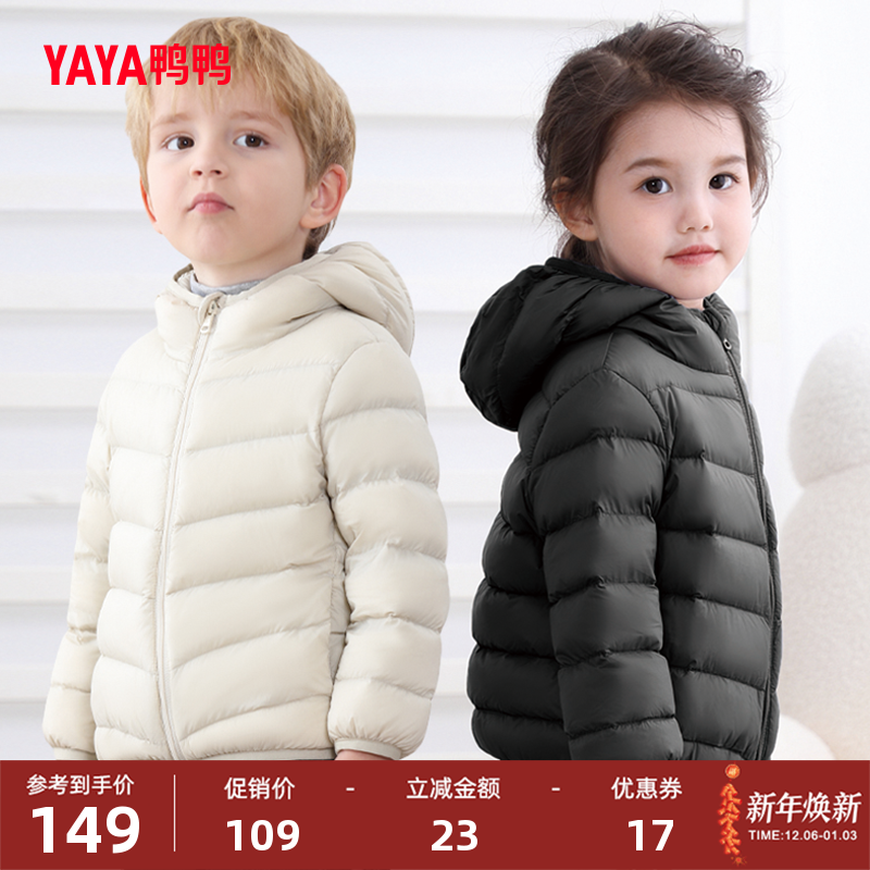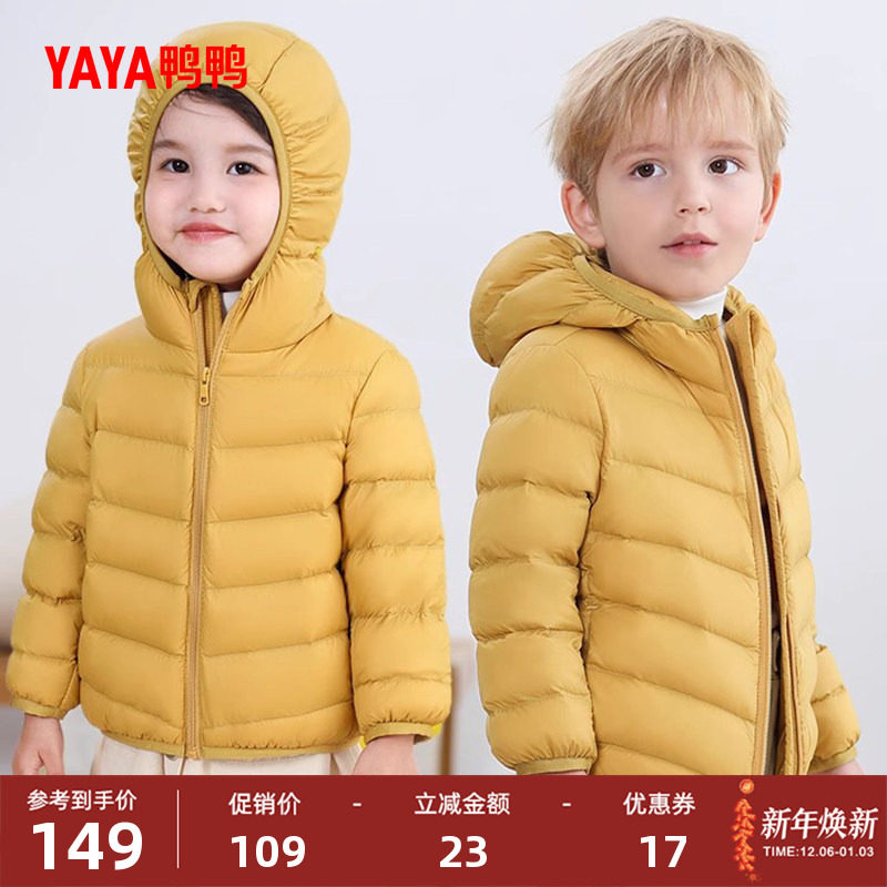 鸭鸭儿童羽绒服冬季轻薄款男童女童时尚休闲短款保暖连帽纯色外套