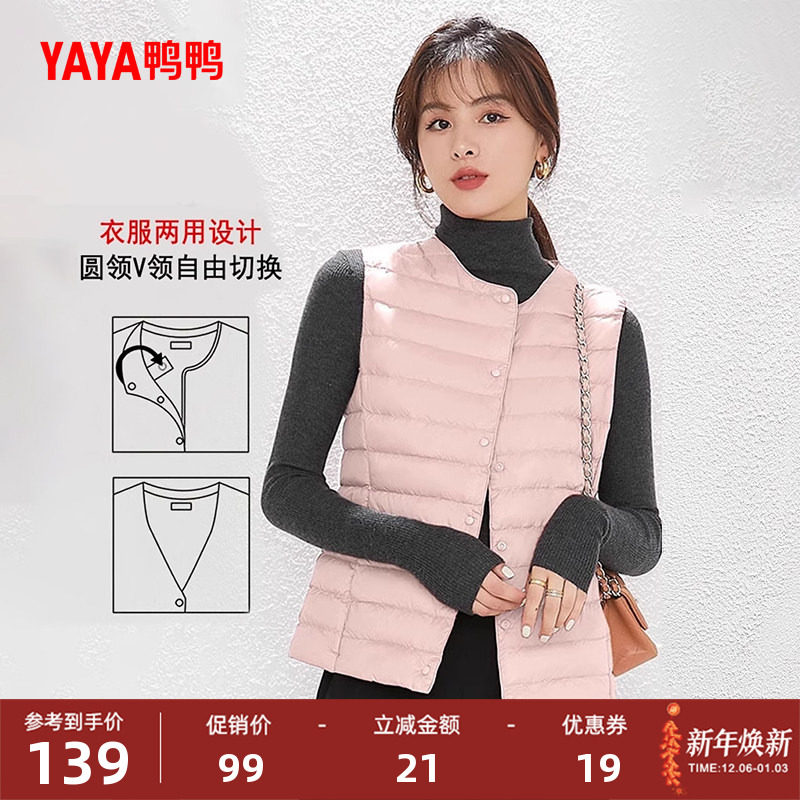 鸭鸭轻薄羽绒服马甲女秋冬季V领基础修身背心内胆鸭绒马夹短外套
