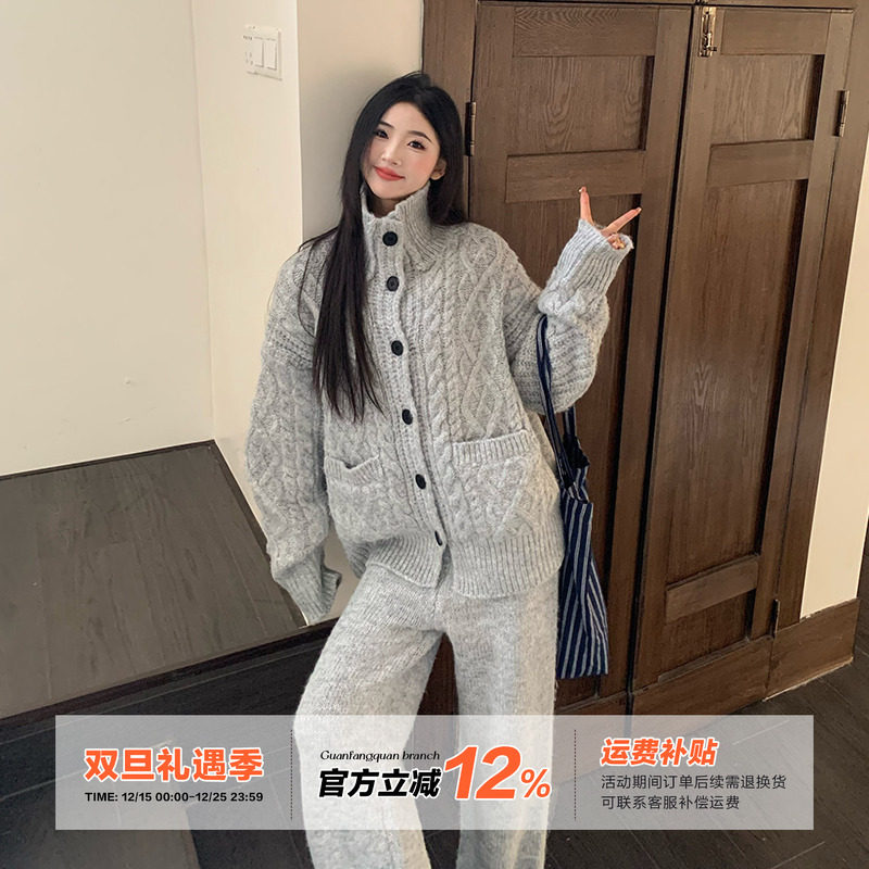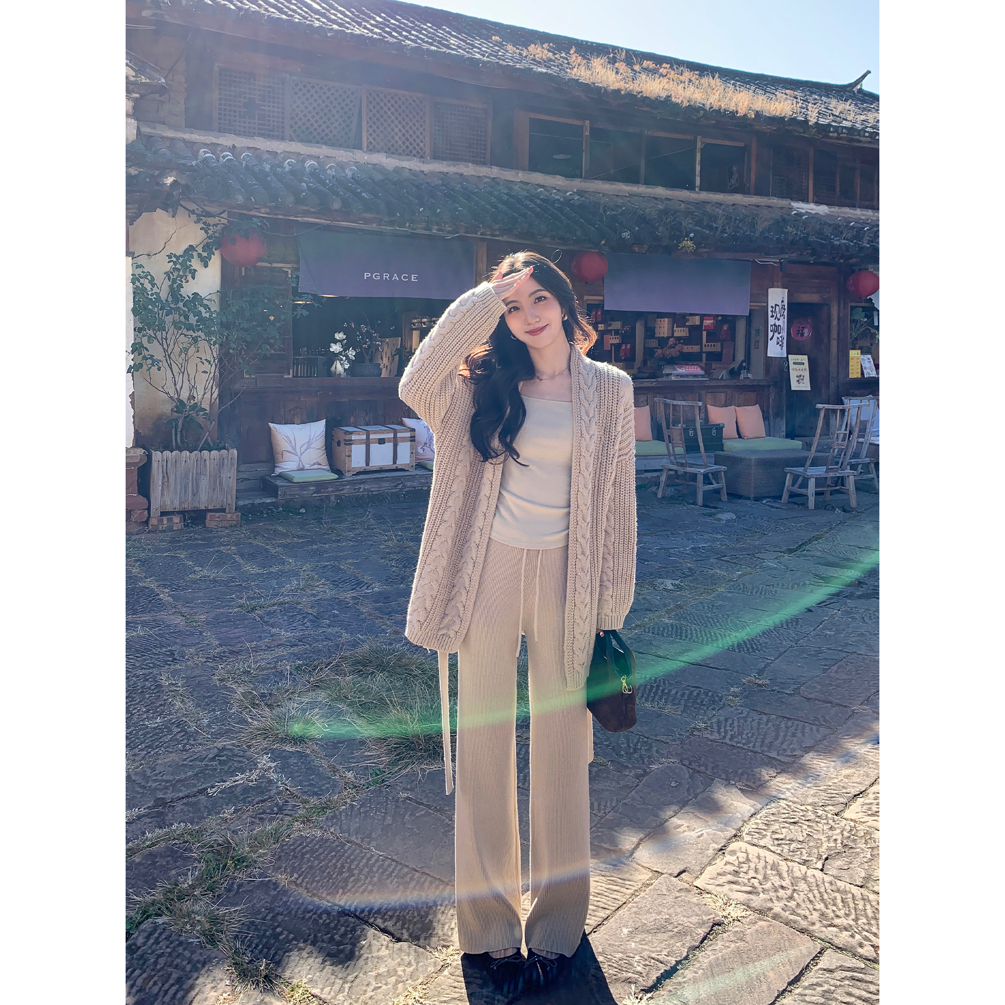 慵懒风软糯针织套装女2025秋冬韩系小香风毛衣开衫+阔腿裤两件套