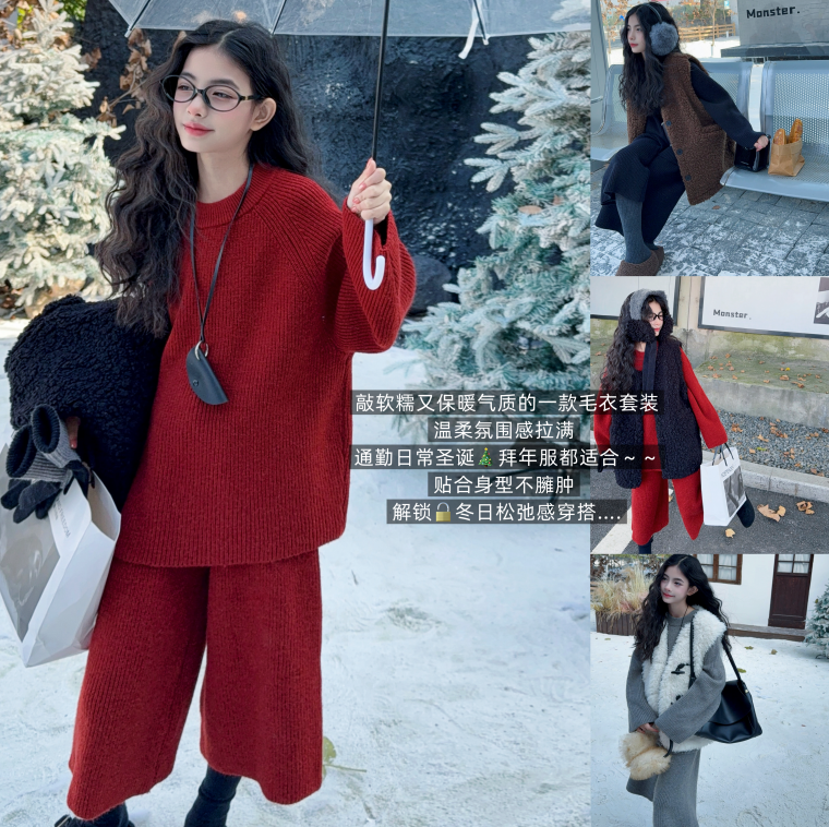 冬季套装女圣诞氛围感红色翻领毛衣马甲棉服时尚洋气阔腿裤三件套