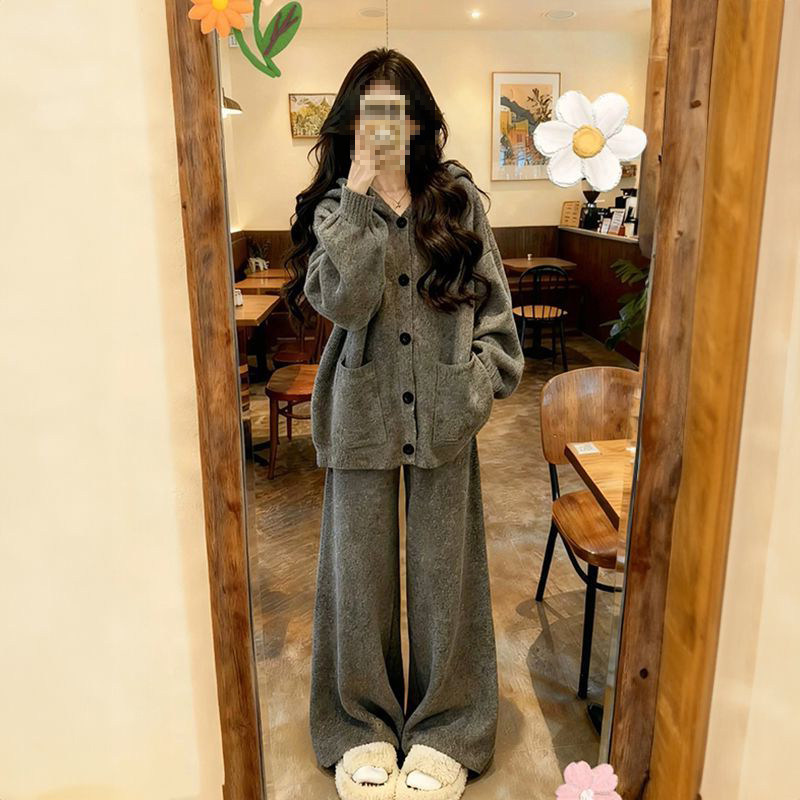 秋冬季复古慵懒风灰色排扣连帽针织毛衣开衫搭配阔腿长裤两件套装