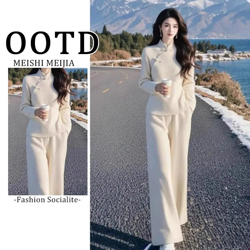 新中式国风休闲气质套装女2025秋冬新款盘扣立领毛衣阔腿裤两件套