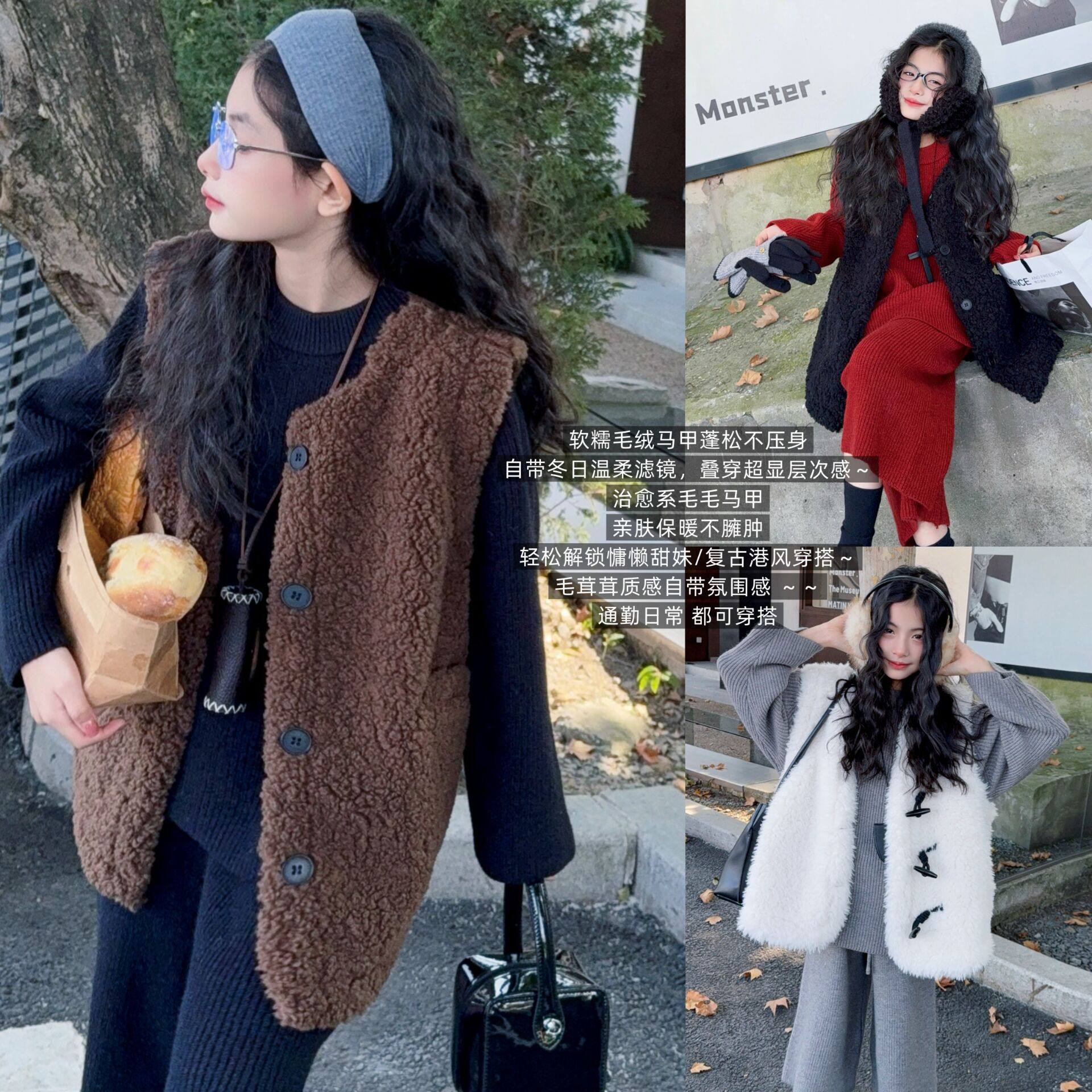 法式通勤慵懒小个子马甲棉服外套+毛衣开衫+灰色阔腿长裤三件套装
