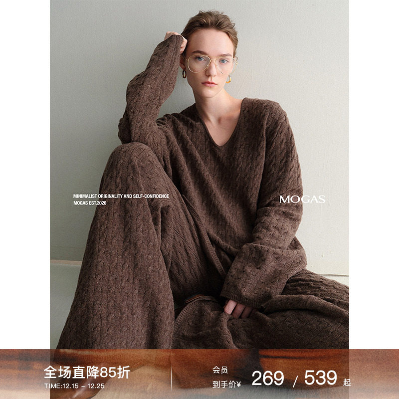Mogas腔调麻花套装 纯羊毛立体肌理V领绞花毛衣阔腿裤三角巾秋冬