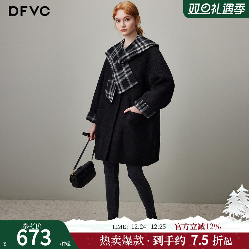 dfvc黑色中长款绵羊毛呢外套女2025冬季新款披肩领格子双面呢大衣