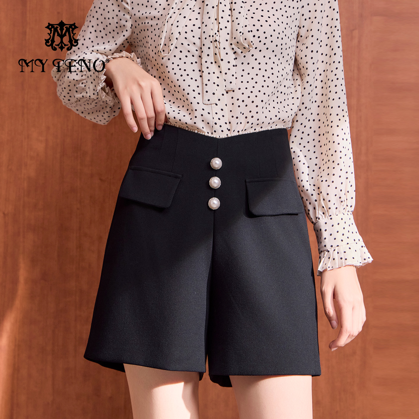 马天奴2025秋冬新款黑色高腰A字短裤时尚百搭显高简约纽扣气质女