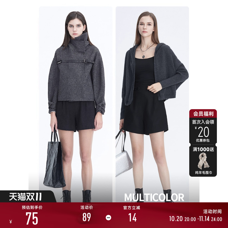 kodice2024秋冬新品女黑色绵羊毛混纺高腰A字短裤裙裤纽扣百搭