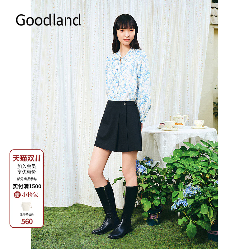 Goodland美地女装2025年春季新款黑色高腰a字短裤裙裤