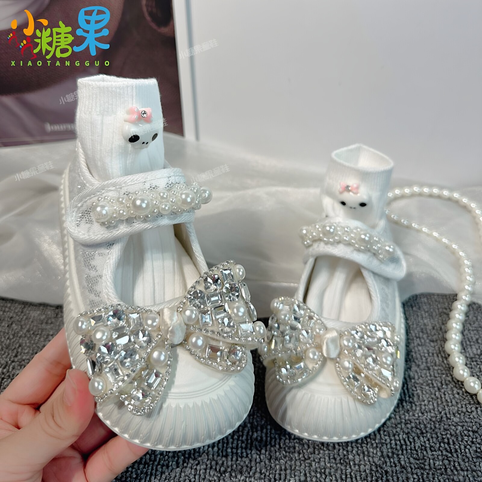 女童鞋子2026新款春秋白色玛丽珍帆布鞋儿童水钻布鞋幼儿园室内鞋