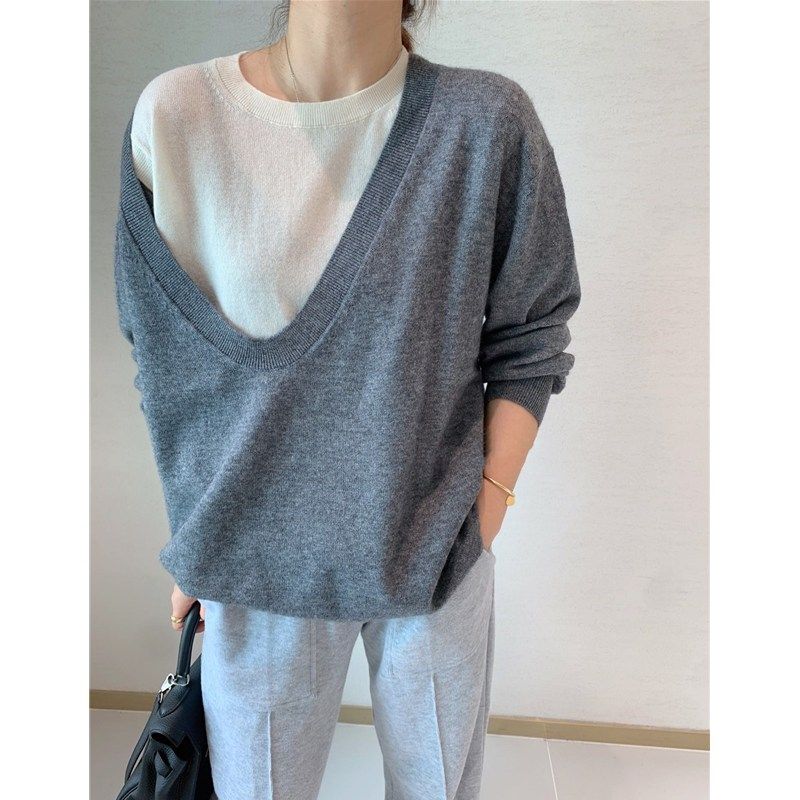 【假两件设计】绵羊毛+山羊绒 大V领撞色拼接套头针织衫毛衣女