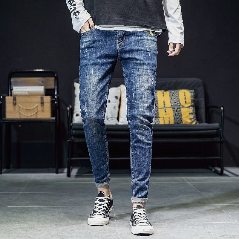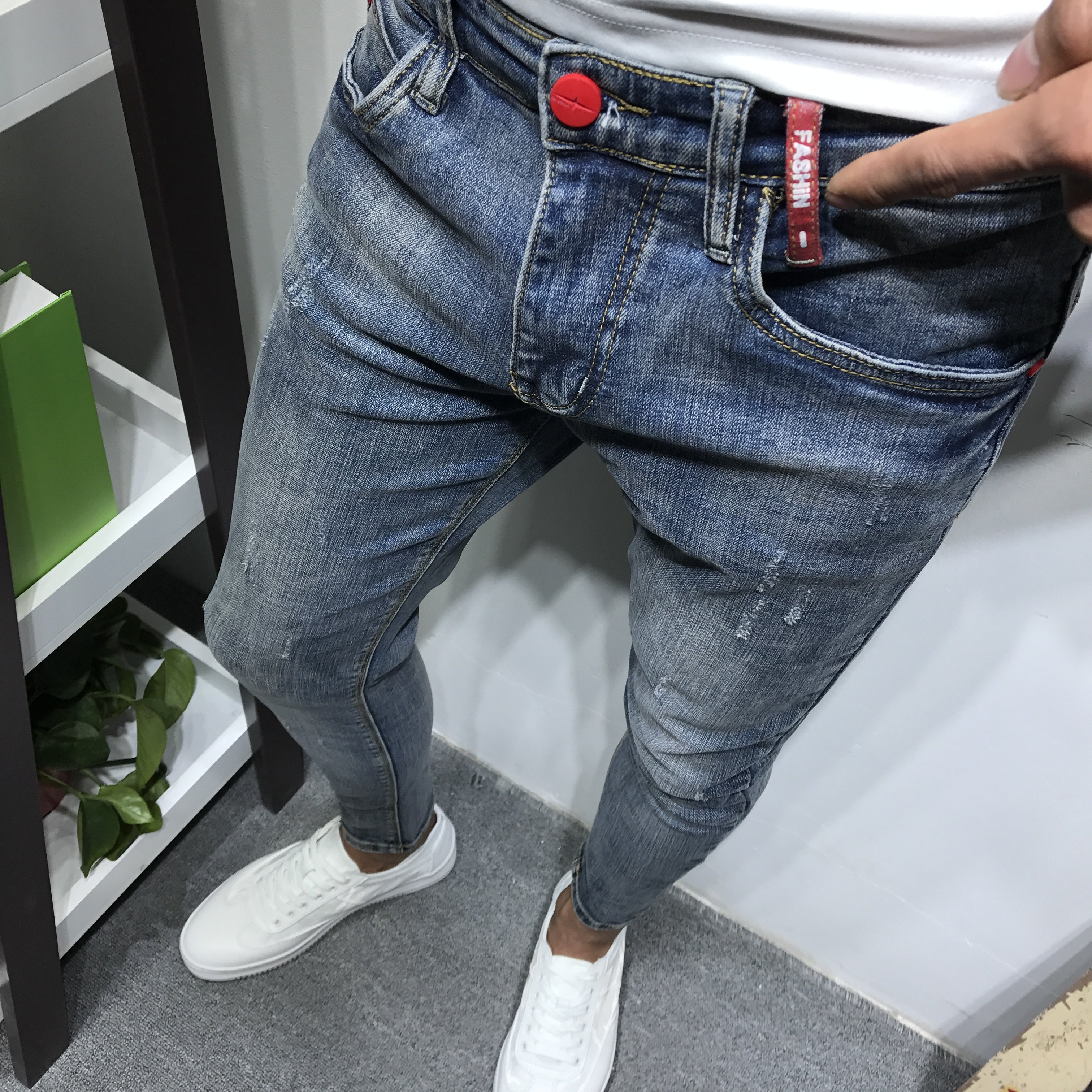 潮男夏季新款修身复古做旧小脚九分牛仔裤男社会小伙快手红人爆长