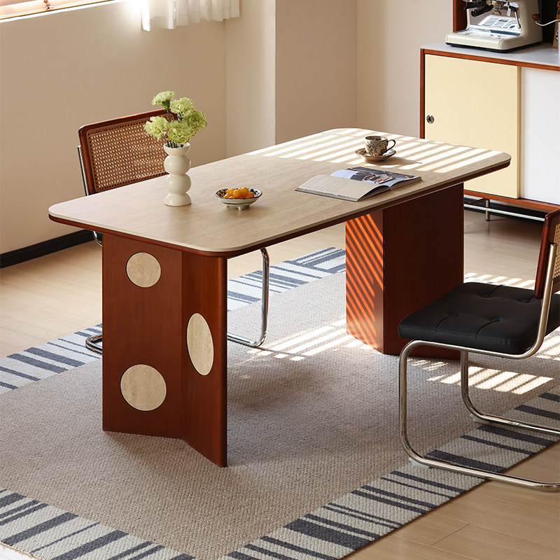 木小咖 中古风洞石岩板实木餐桌法式复古风小户型长方形客厅饭桌