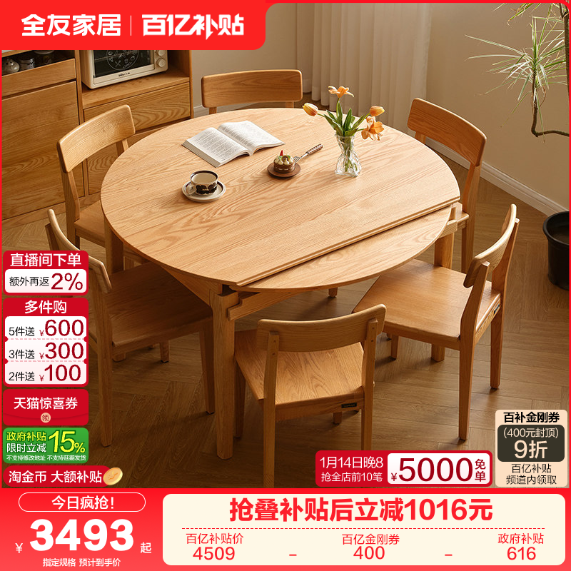 全友家居北欧风橡木实木餐桌椅组合客厅家用多功能可伸缩圆形饭桌