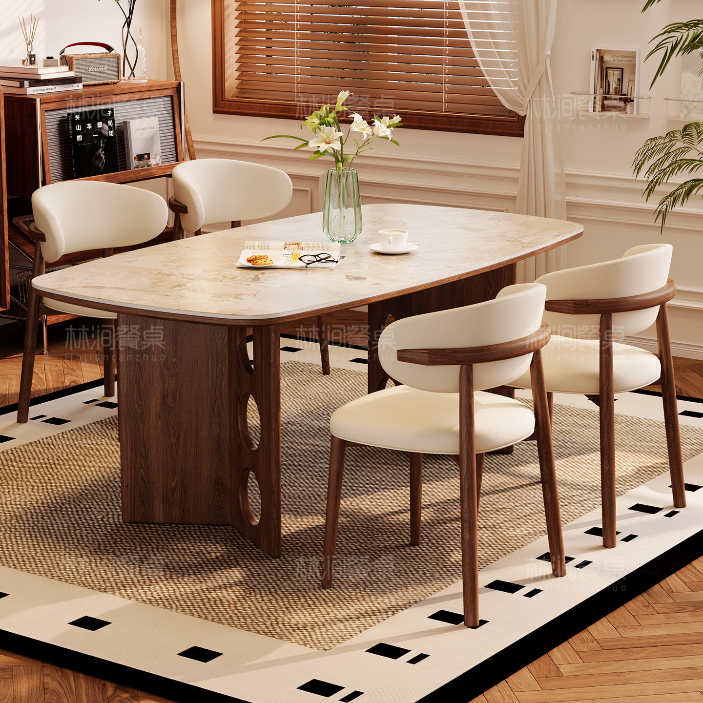 小万家具/中古风实木餐桌餐厅洞石岩板饭桌吃饭桌子家用桌椅组合