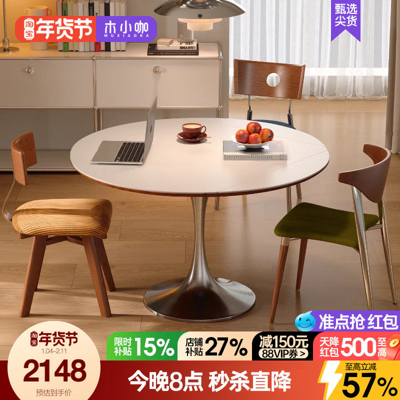 木小咖实木餐桌家用折叠可变圆桌简约现代饭桌伸缩岩板餐桌椅组合